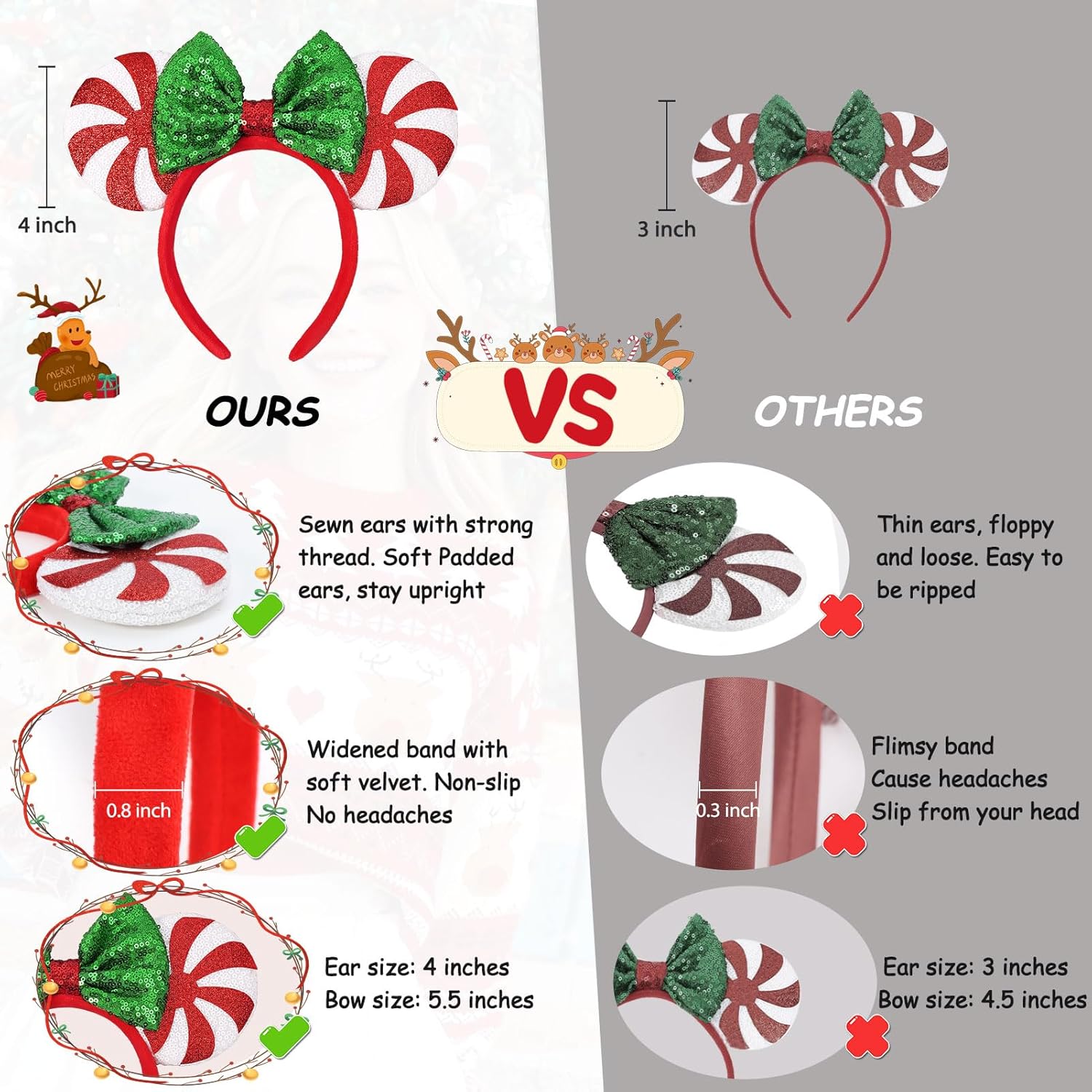 Step into the holiday season with festive flair by wearing this dazzling Christmas Mouse Ears Headband! Crafted in classic Christmas colors—red, green, and white—this headband is adorned with cute candy overlays on the ears and big, sparkly bows in the center, making it the perfect accessory to spread holiday cheer. The festive design is sure to get you in the Christmas spirit while adding a fun, playful touch to your outfit. With hand-sewn, durable construction, these mouse ears are designed to stay in shape and shine bright all season long.