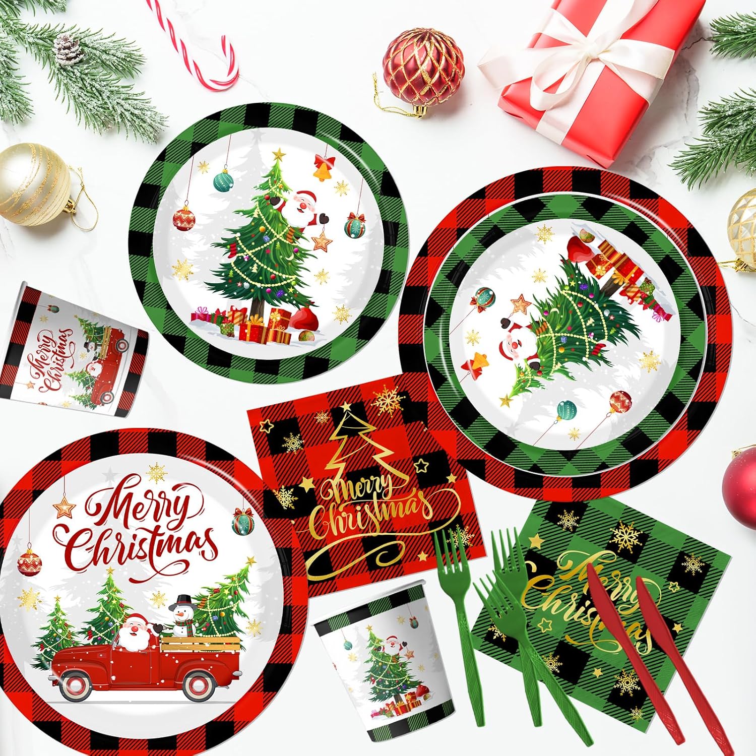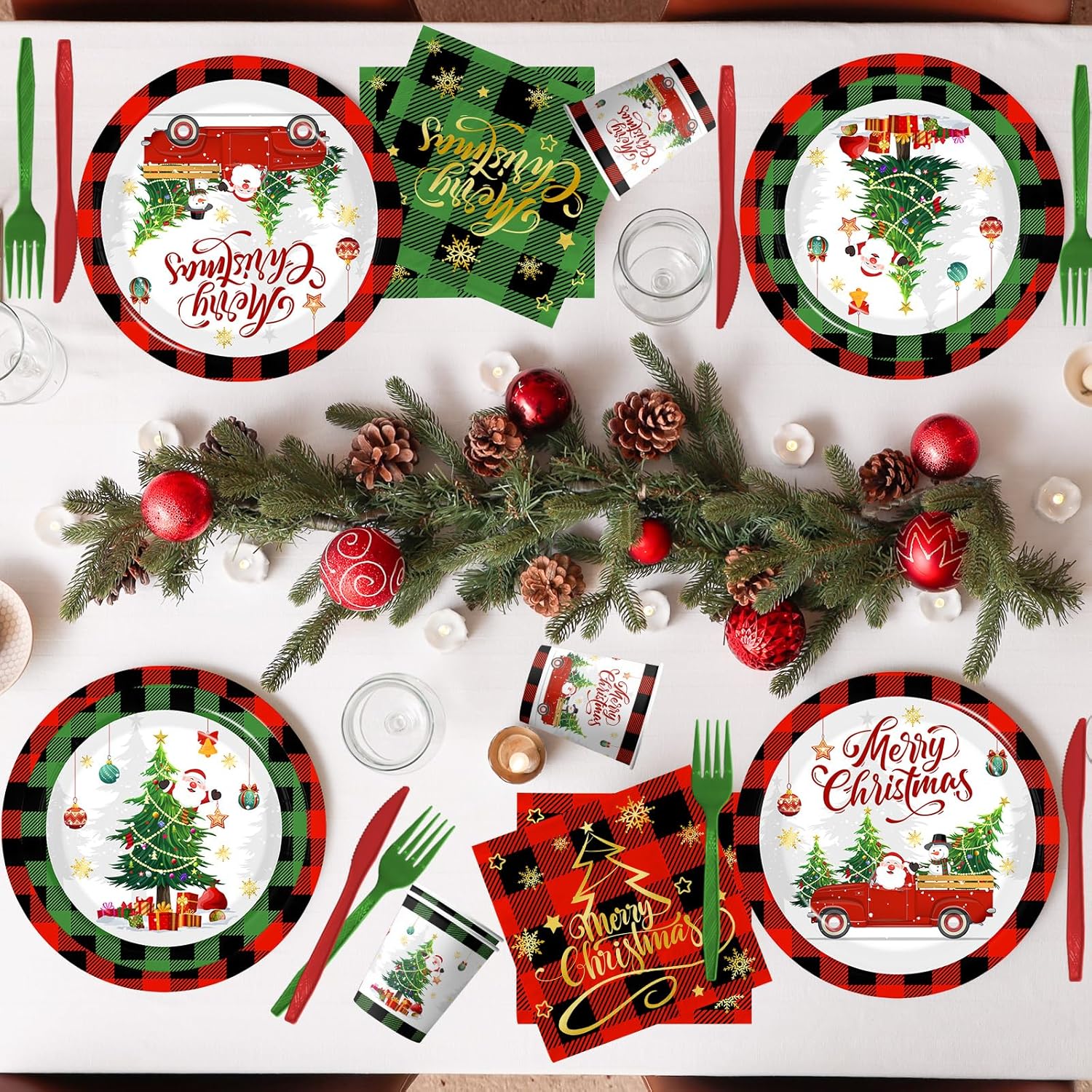 - Includes: 24 x 9-inch Christmas dinner plates, 24 x 7-inch Christmas tree dessert plates, 24 cups, 24 red and green napkins, and 24 forks and knives