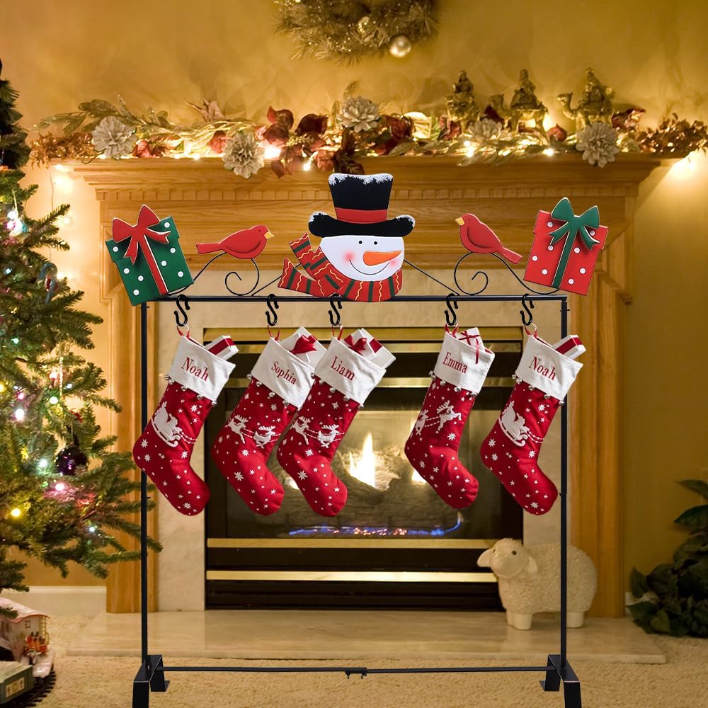 Add charm and festive elegance to your holiday setup with this Unique Design Christmas Stocking Holder Stand. Crafted from premium wrought iron with a warm antique bronze finish, this freestanding holder features a joyful snowman adorned in a classic hat and bright scarf, flanked by two cheerful red birds and two beautifully wrapped gift boxes. With five sturdy hooks for hanging stockings, this eye-catching piece becomes a heartwarming focal point in your home. Whether placed near your Christmas tree, entryway, or as a centerpiece, it brings the magic of the holidays to any space—no fireplace required!