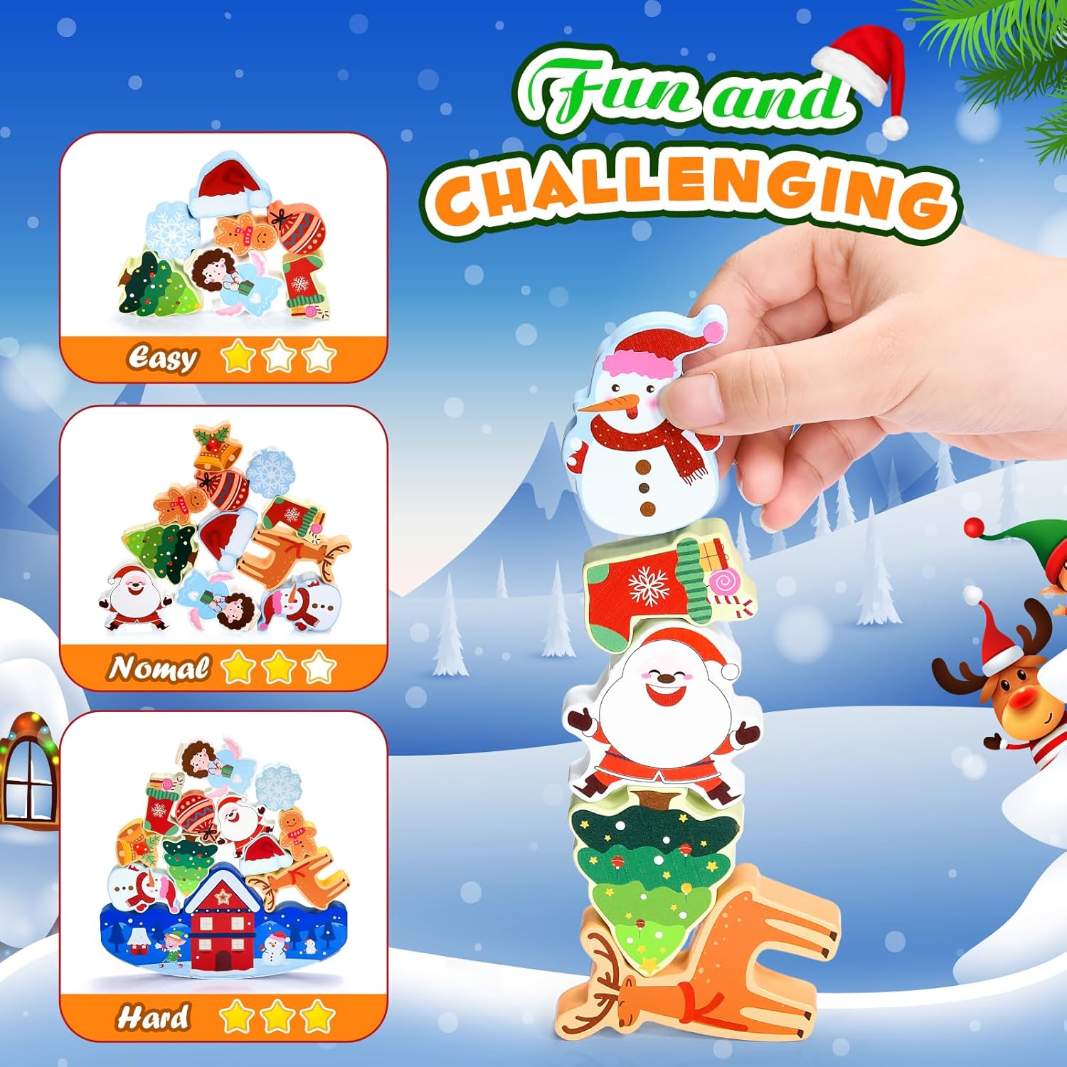 - Unique Christmas Design: Includes 1 balance base and 11 wooden blocks shaped like classic Christmas elements (such as trees, snowflakes, Santa, etc.).