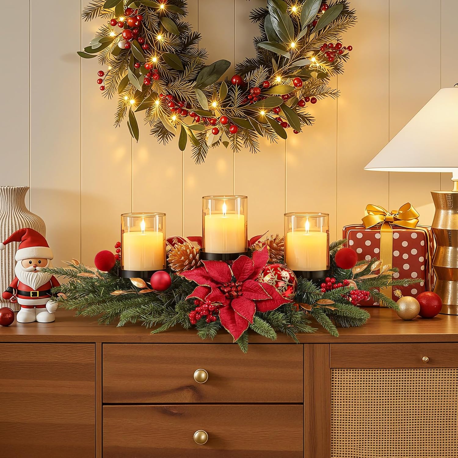 Create a warm and festive ambiance with this beautifully crafted Christmas candle holder centerpiece. Designed in a traditional holiday palette of red, green, and gold, it features a rich arrangement of holly leaves, pinecones, red berries, poinsettias, golden leaves, and red ornaments. The centerpiece includes three built-in candle holders, ideal for standard pillar candles (not included), and provides an elegant glow perfect for Christmas dinners, mantel displays, or holiday gatherings. Sturdy and stylish, it’s a timeless addition to your seasonal décor.
