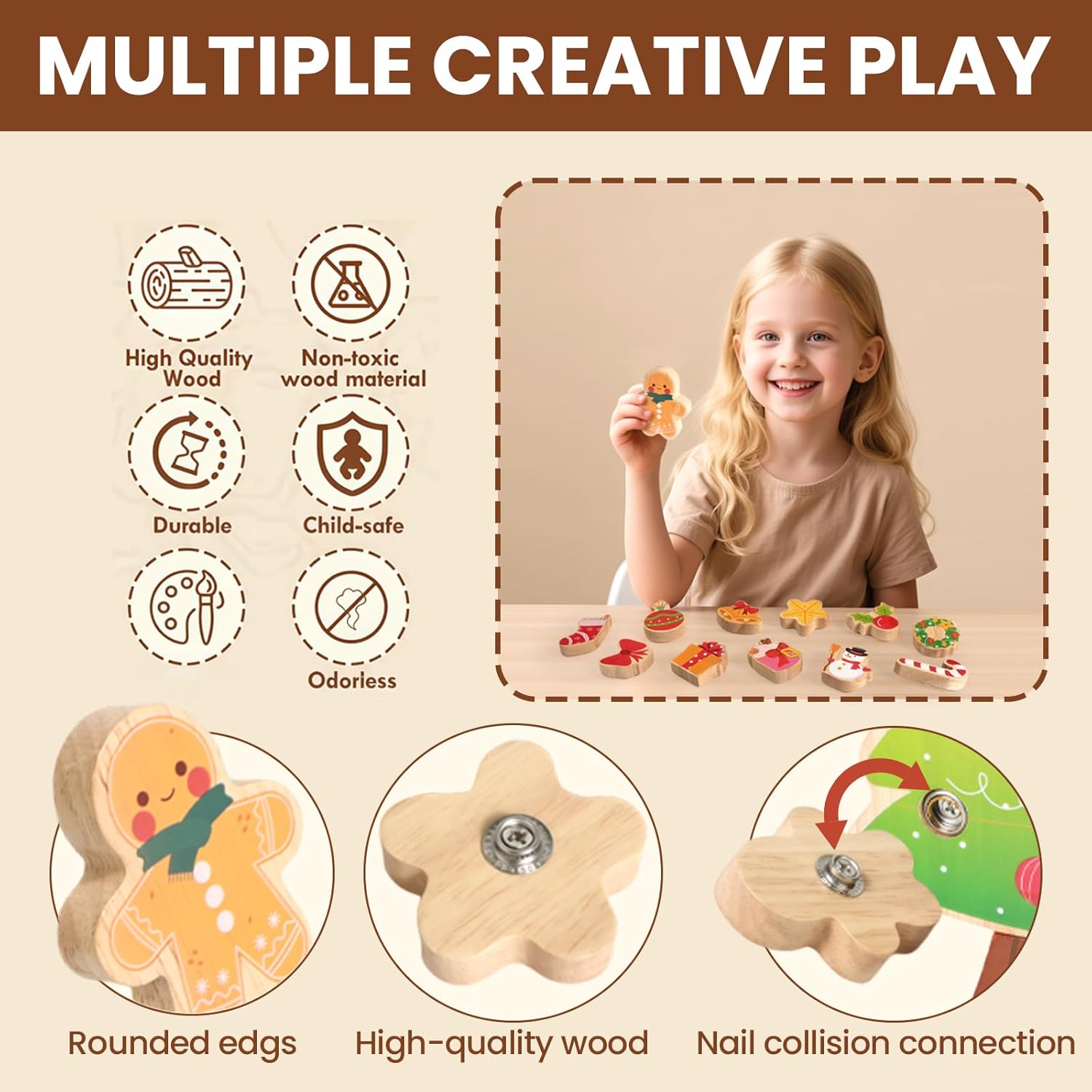 - Ornaments: 12 colorful wooden decorations (candy canes, stockings, stars, gingerbread men, presents)