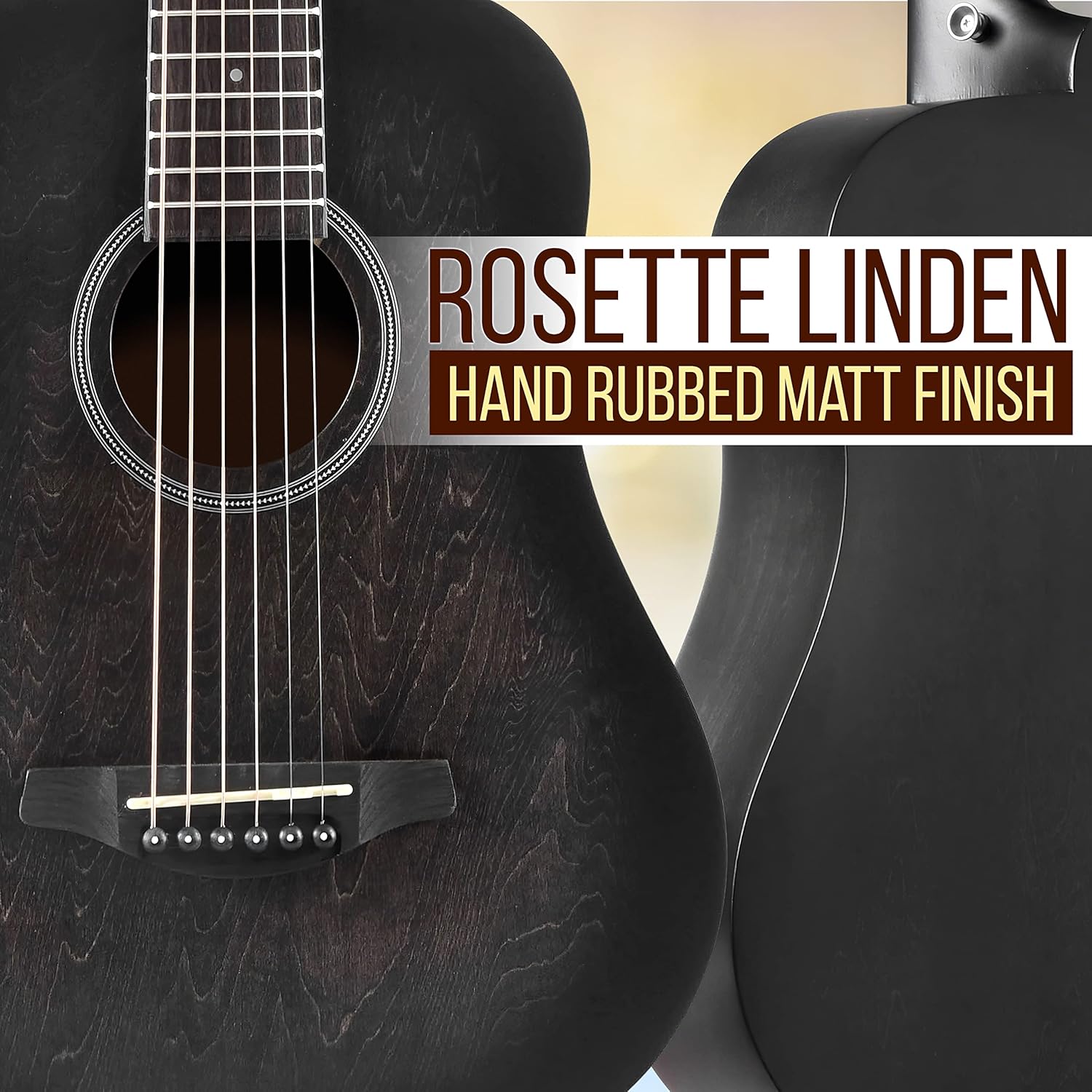 This 34” acoustic guitar set is a complete all-in-one package, perfect for beginners and experienced players alike who want to enjoy warm, vibrant sound. Crafted with a traditional body style, it features a hand-rubbed matte varnish finish and diecast chrome-plated tuning pegs for durability and aesthetic appeal. The guitar’s body, including top, back, and sides, is made from handcrafted linden plywood, complemented by a high-density fingerboard and bridge for excellent playability. Equipped with steel strings and packed with essential accessories like a gig bag, six spare strings, a detachable nylon shoulder strap, cleaning cloth, and picks, this set has everything you need to start playing right out of the box.