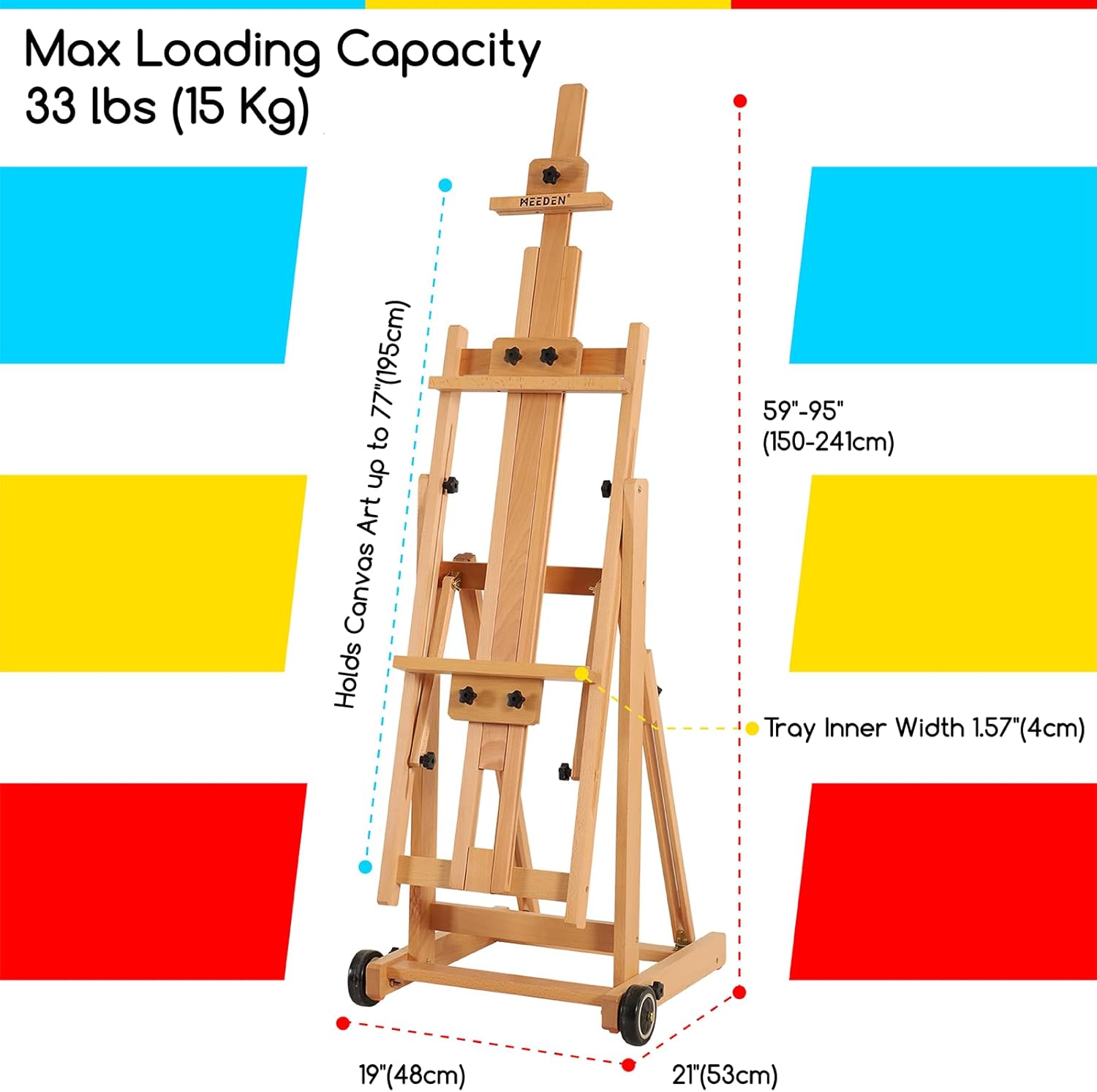 Crafted from finely sanded, solid beechwood, this versatile Studio H-frame Easel is designed for artists who think and work big. Its total height is adjustable from 59" (150 cm) to 95" (240 cm), with a tilting vertical mast that holds canvases up to 77" (196 cm) tall. Equipped with three adjustable sliders, the mast can be tailored to fit various canvas sizes and angles, meeting all your painting needs. The easel features two large rolling wheels for effortless mobility and secure locking, while its wide stance and sturdy foundation provide exceptional stability, making it ideal for serious artists working on large-scale projects. For those with wider canvases, the deluxe model offers even more versatility.
